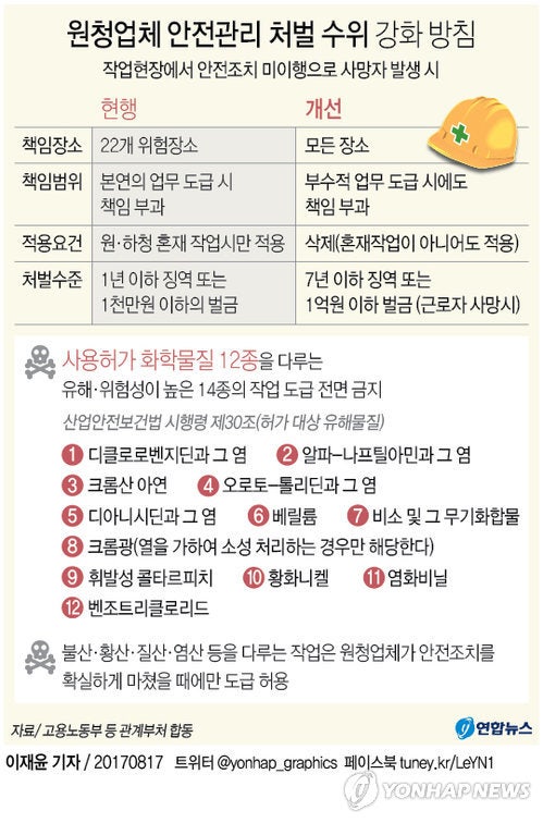 (서울=연합뉴스) 김범수 기자 = 내년 하반기부터 산업재해 사망사고 때 안전조치 미이행 사실이 드러나면 원청업체도 하청업체(협력업체)와 똑같이 7년 이하의 징역 또는 1억원 이하의 벌금을 물리는 등 처벌이 대폭 강화된다.