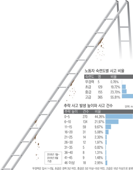 강태선 세명대 교수(보건안전공학)는 “낮은 높이 추락 사고에서 A형 사다리 사용도 주요 원인으로 보인다”며 “연구자들은 알지만 정작 당사자들은 그 높이에서 떨어지면 죽을 수도 있다고 전혀 생각하지 못하고 작업한다”고 말했다. 실제 사다리를 사용한 추락 사망 사고는 지난 1년9개월간 36건 발생했다.