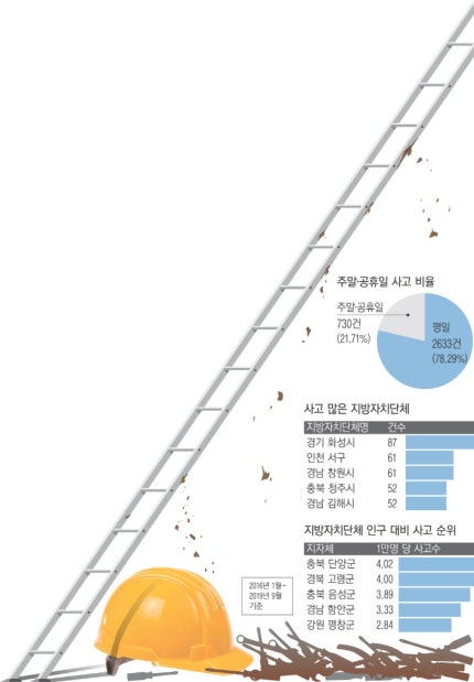 2016년부터 올해 9월까지 사망 사고의 21.7%는 주말, 공휴일에 발생했다. 전국건설노조 이승현 노동안전국장은 “건설 현장은 주휴수당이 없고 일만 있으면 휴일에도 나가야 하다 보니 충분히 쉬지 못한 채 계속 일하게 돼 금·토·일에 사고가 많다”고 말했다.